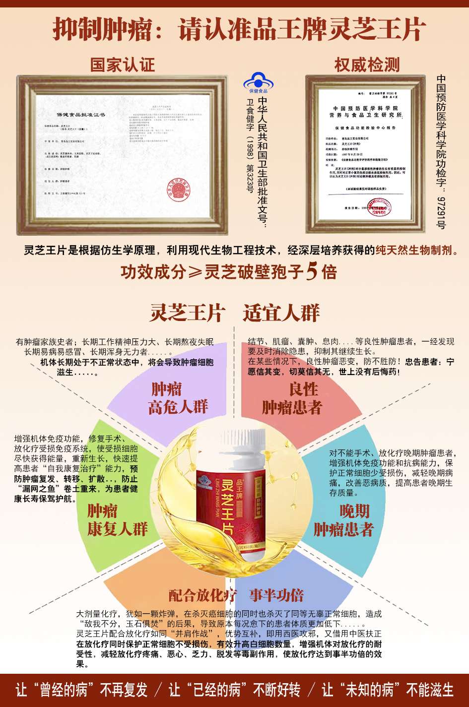 灵芝王片是国家卫生部批准的正规保健食品,易吸收、功效成分高于灵芝孢子粉5倍以上长期服用可增强机体免疫力,预防各类疾病发生。因为免疫功能低下是万病之源!
