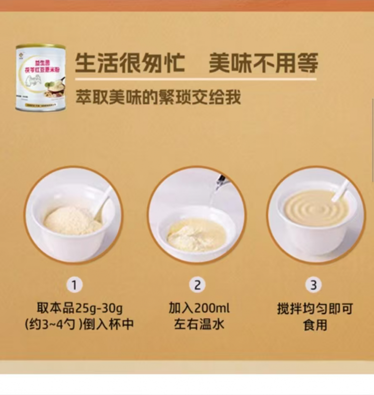 产品特点:【产品名称】:益生菌茯苓红豆薏米粉 【规格】:800g/罐(内含量勺) 【保质期】:24个月 【品牌】:恒赪 【配料】:红豆20%、薏米18%、茯苓15%、乳粉、木糖醇、红枣、黄豆、莲子、糙米、 益生菌 冻干粉(干酪乳杆菌冻干粉、两歧双歧杆菌冻干粉)2% 【冲泡方法】: ①取本品25-30g(约3-4勺)倒入杯中; ②加入200ml温开水充分搅拌均匀即可饮用; ③浓淡可根据个人喜好自调,冷热饮皆宜,风味甚佳。 【食用建议】: ①本品适合早餐、宵夜、点心、减肥代餐、课间充饥; ②可添加