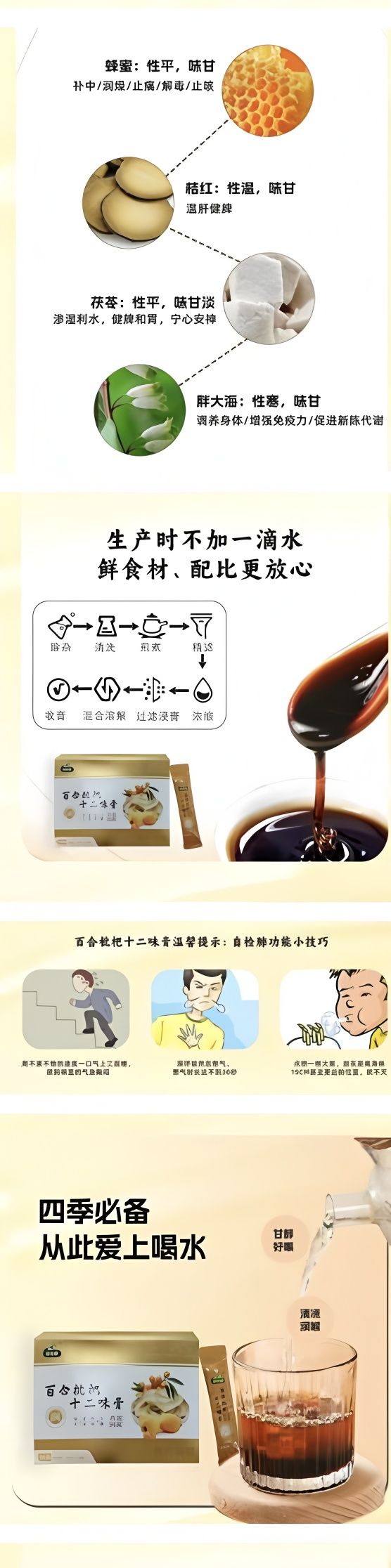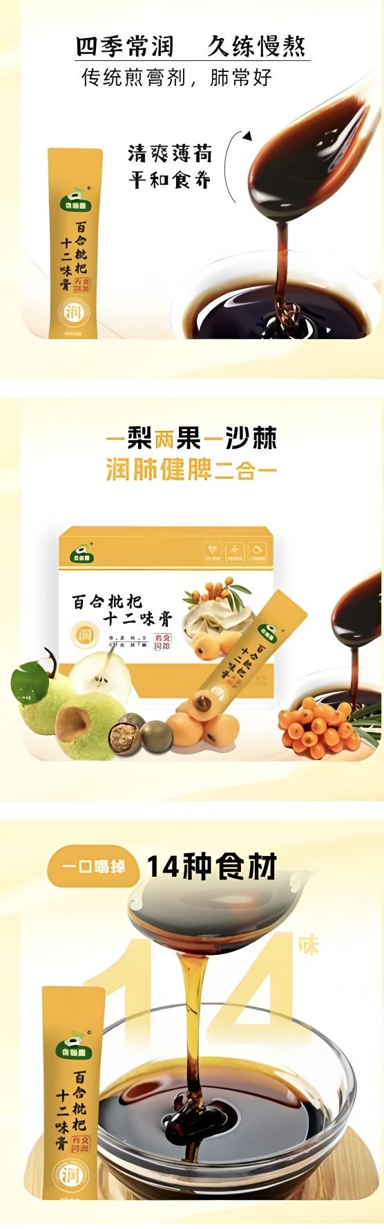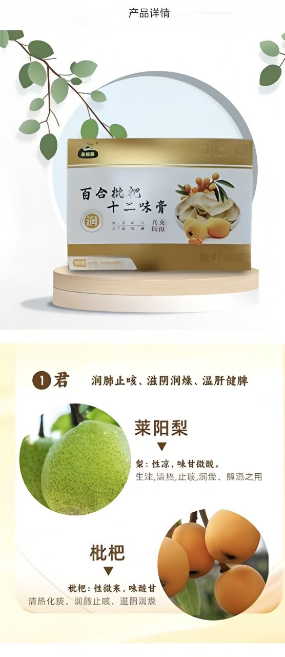 百合枇杷十二味膏是一个药食同源的百年中医配方,传承自明《古今医方集成》 古方以君药“梨”及功能“润肺”而得名。但其实润肺膏方自唐朝就已经存在,一直是皇家御用的宫廷滋润秘方。直到清朝才流入民间,当有喉咙不适、感冒咳嗽的时候,总会喝上一碗甘甜清凉的膏滋,喉咙润润的很舒服。 中医讲: “肺,喜润而恶燥,燥胜则干,肺燥津伤。” “脾为生痰之源,肺为贮痰之器” 治疗肺损伤,润肺是根本,健脾是关键。 组方亮点:一梨两果一沙棘为君,统领复配10味臣佐使食材,润肺健脾二合一。