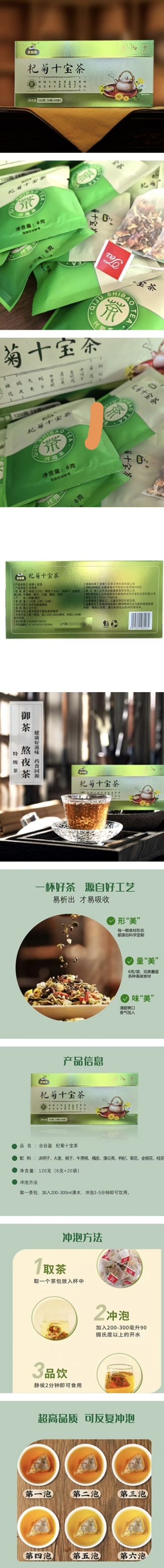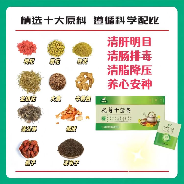 杞菊十宝茶,护肝、养肝,远离“肝”扰! 杞菊十宝茶的每一个成分,都不是为了凑数,每个原材料的功效,都按照中医护肝养肝之: “清脂→排毒→消炎→修复→滋养”五步来调配的, “相辅相成”的自然养肝配置,多一分嫌多,少一分不足: ☛第一步:清脂 代表成分:决明子、牛蒡根、枸杞、菊花 ☛第二步:排毒 代表成分:决明子、栀子、牛蒡根、蒲公英、菊花、金银花 ☛第三步:消炎 代表成分:决明子、栀子、牛蒡根、蒲公英、菊花、金银花、桂花 ☛第四步:修复 代表成分:橘皮、枸杞、大麦 ☛第五步:滋养